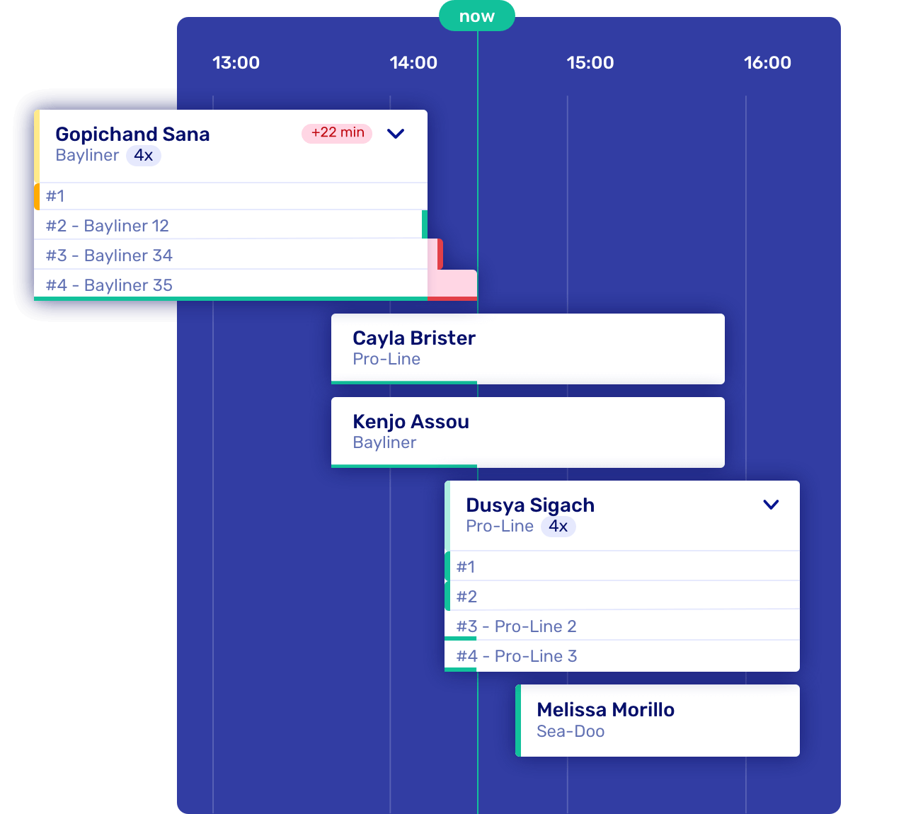 At Let's Book, we've made it possible for you to link a boat to a booking and track the booking's progress with color-coded indicators: green for smooth sailing, yellow for setting sail soon, and red for "oops, they're running late!"