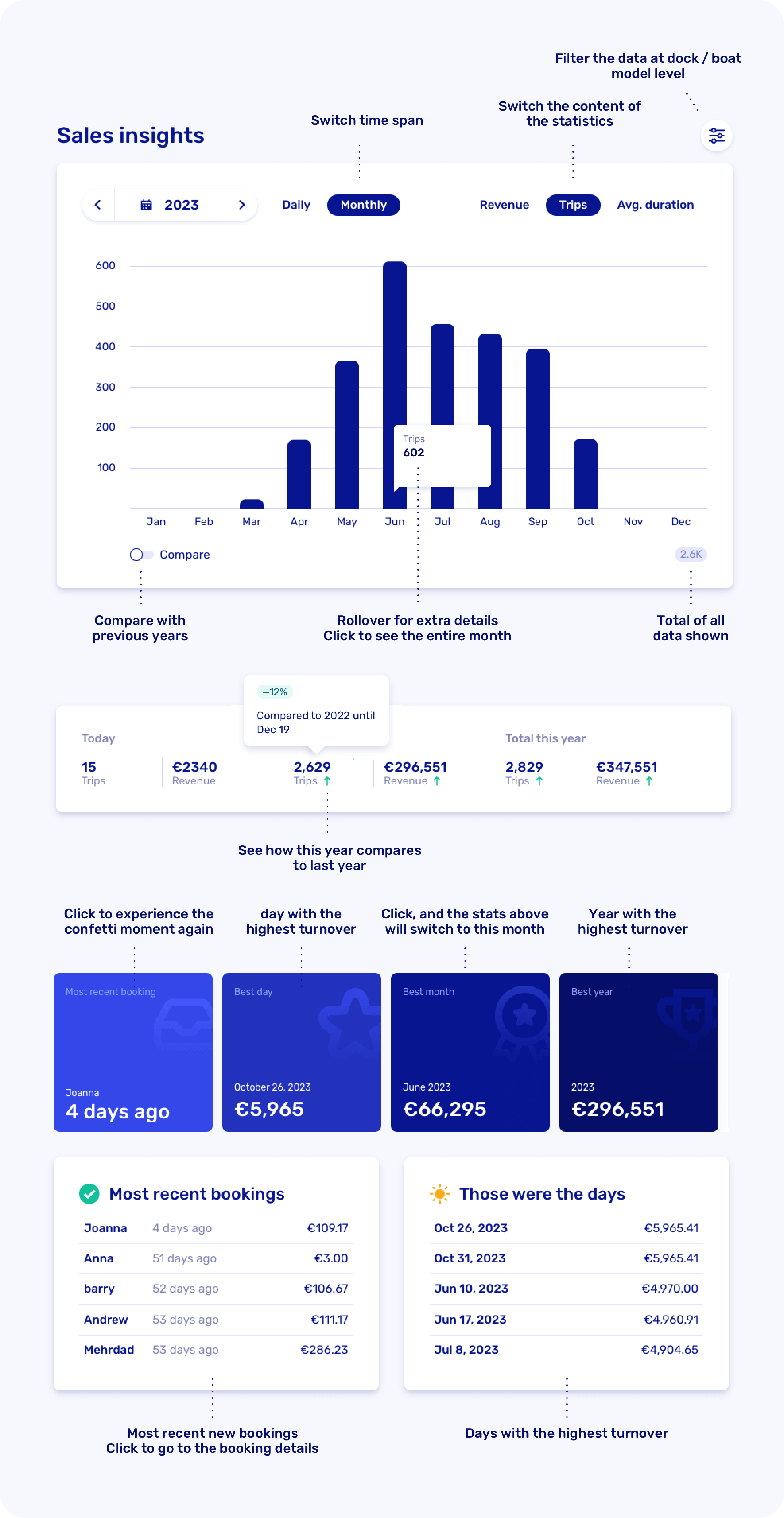 We're thrilled to announce the arrival of our brand-new Sales Dashboard, crafted with your rental business success in mind. Now, gain a comprehensive overview of your rental performance at a glance. Filter effortlessly by revenue, trips, or average duration, and dissect statistics by location or boat type for deeper insights.
